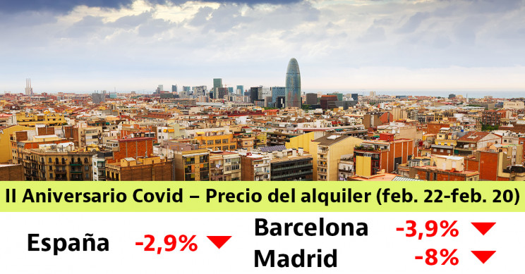 El precio de alquiler en España ha terminado este mes de Febrero en 10,7€ por metro cuadrado suponiendo una caída del 2,9% con respecto a Febrero del año 2020.
