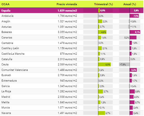 Siguiendo el gráfico, las cuatro comunidades con mayor precio son Cataluña (2.313€ por m2), seguido por Euskadi (2.706€ por m2), Madrid con 2.938€ por m2 y en la corona Baleares con 3.355€ por m2.