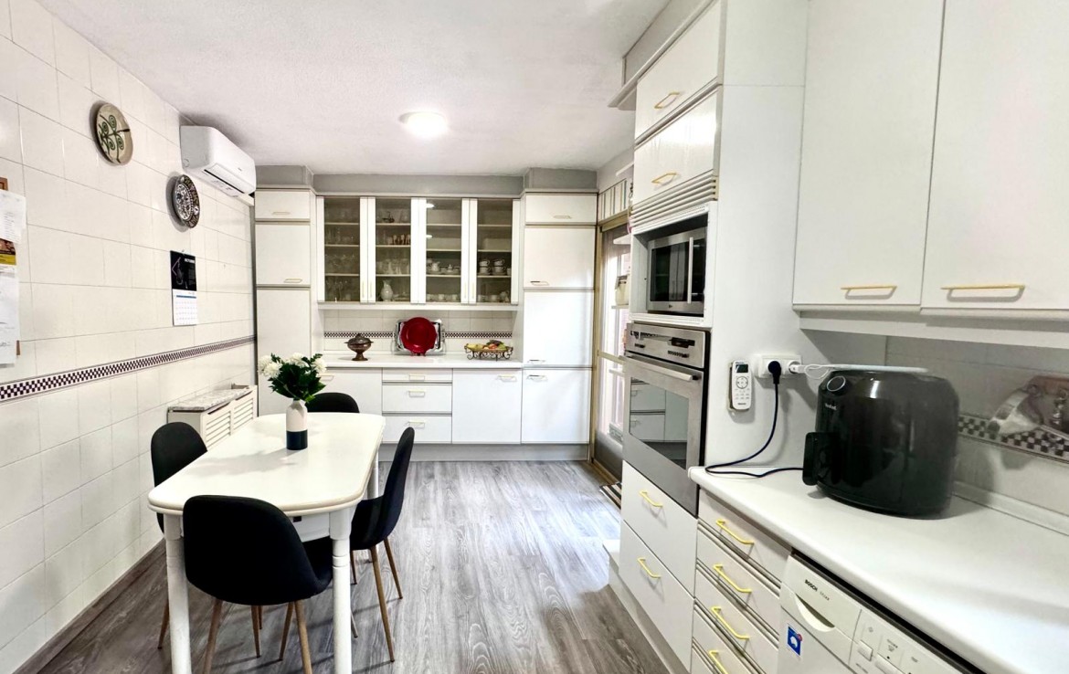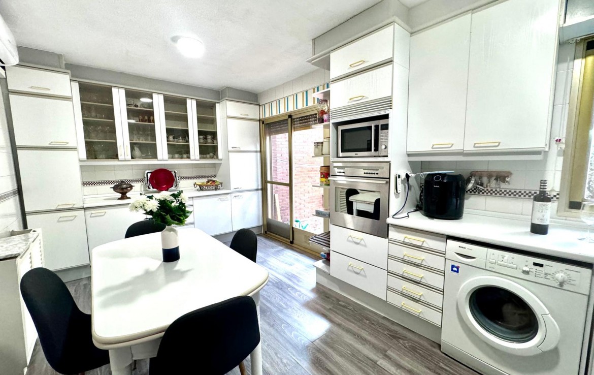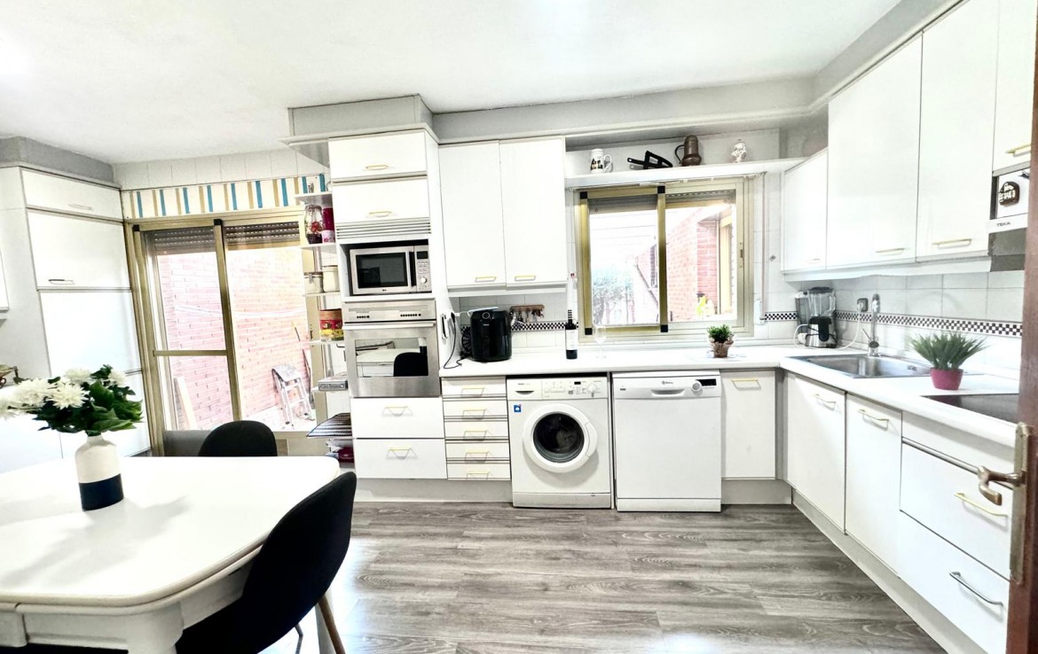 Al otro lado del salón, en primer lugar, tenemos un aseo de cortesía y, al otro lado, tenemos una amplia cocina muy luminosa con mobiliario alto y bajo de gran capacidad y con espacio para poder comer en esta misma estancia.