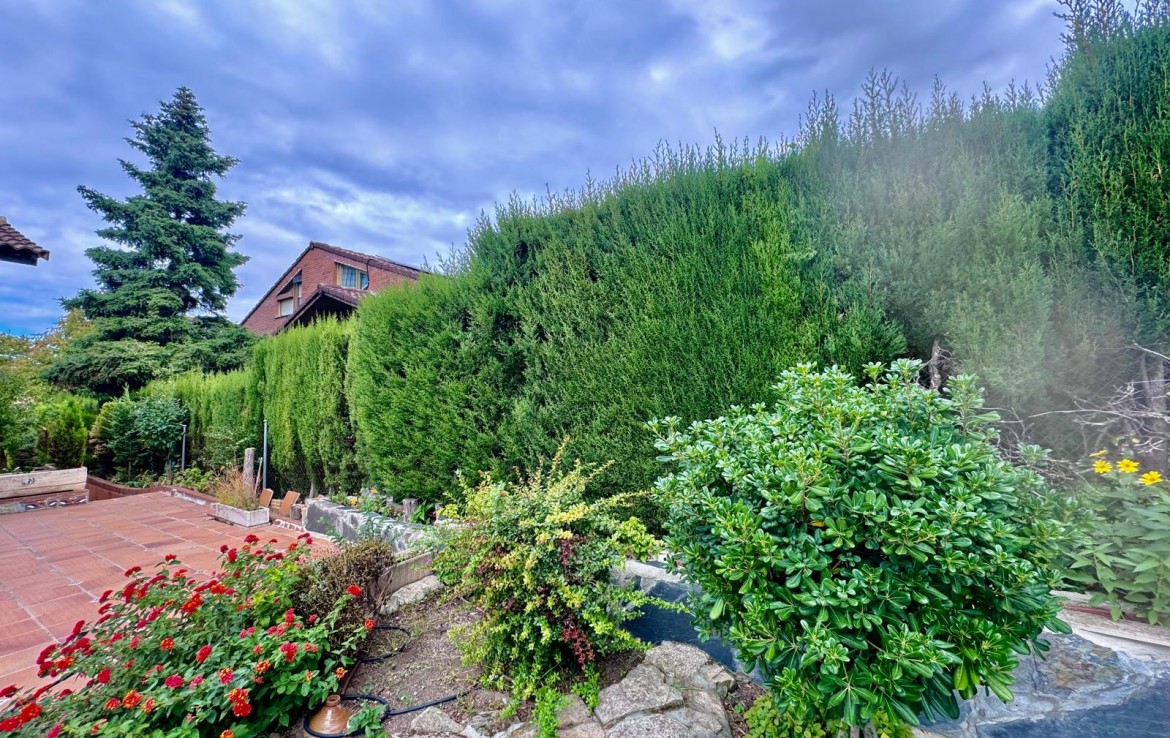 Nada más entrar, tenemos a mano izquierda un jardín con tres diferentes zonas: una primera que da acceso a la casa que se encuentra llena de plantas y vegetación, al fondo una zona amplia con donde encontramos la piscina y solárium, y a la vuelta de la casa un acogedor recibidor para comidas y cenas que es perfecto para aprovechar el buen tiempo.