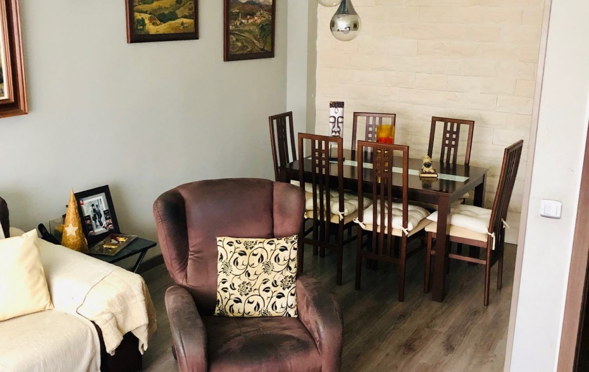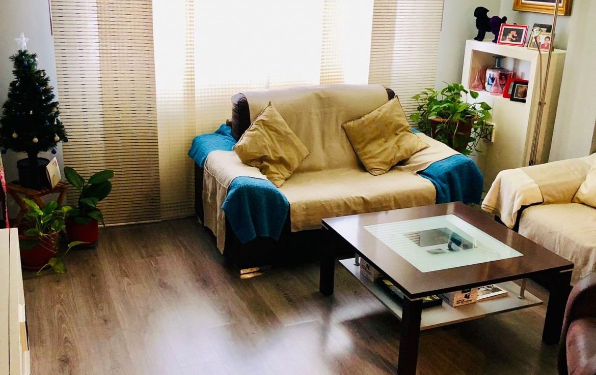 Justo enfrente del baño y de la cocina, nos encontramos el salón, la estancia más grande de toda la vivienda y que tiene vistas exteriores. El salón dispone del espacio suficiente para poder albergar dos ambientes: salón para el ocio y el relax, y zona de comedor para las reuniones familiares.