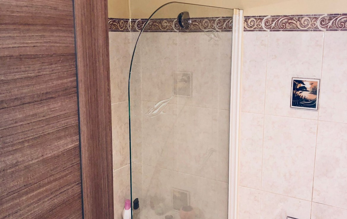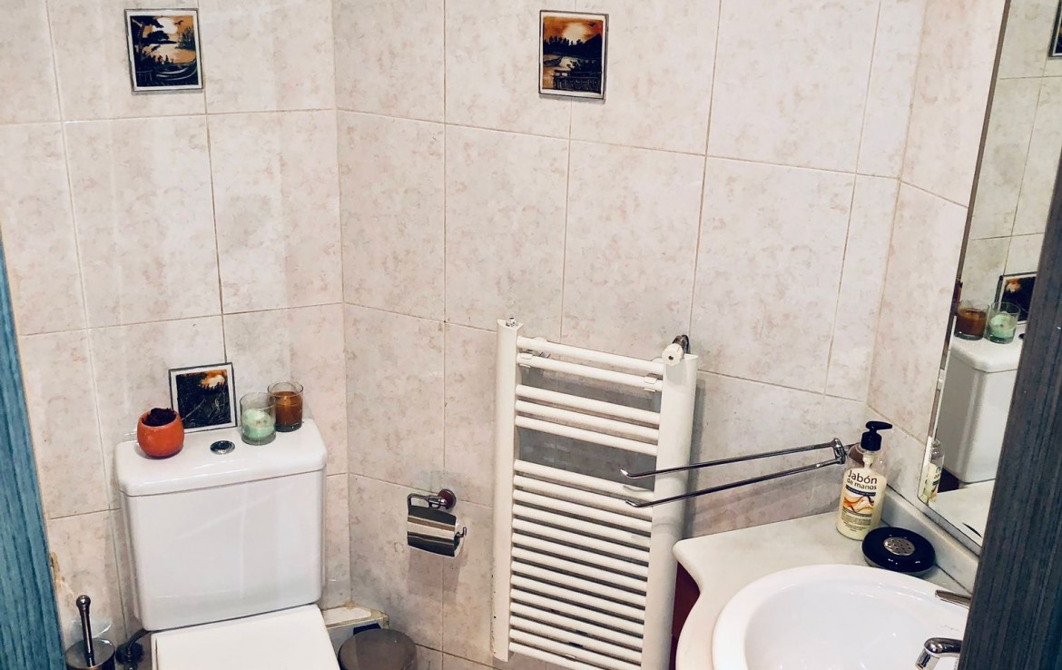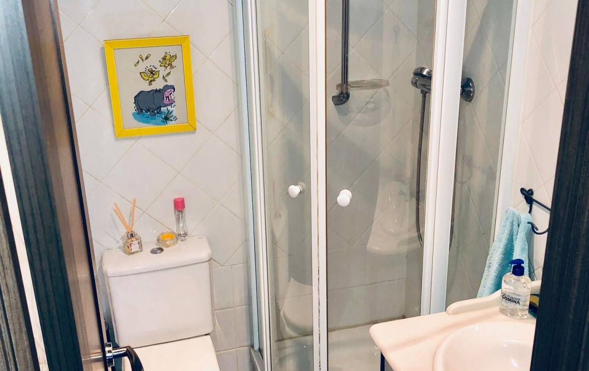 Siguiendo a través del pasillo, encontramos el baño común que está totalmente equipado con lavabo, WC y plato de ducha.