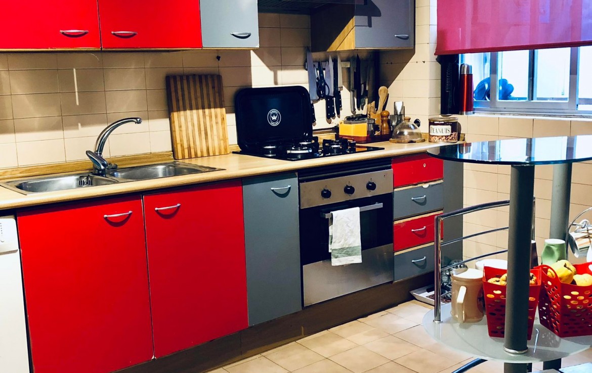 A continuación, nos encontramos con la cocina que se encuentra totalmente amueblada con mobiliario alto y bajo de gran capacidad y que dispone de buen tamaño para disponer de una mesa con sillas para comensales. Anexada a esta, encontramos un tendedero que aumenta el almacenaje de la cocina.
